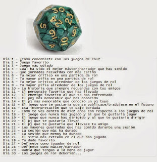 Empezamos con el Desafío de los 30 días en el rol. Para que sea más fácil de localizar estas entradas en el blog, todas ellas van a ir con la etiqueta D30D. La propuesta surgió desde Trasgoaturo y en Rol en el Castillo he decidido seguirla, así que allá vamos.